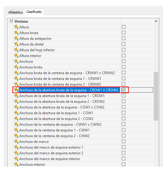 5. En Estilos de ventana seleccione Anchura de la abertura bruta de la esquina - CROW1 X CROW2.