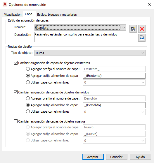 Modifique las reglas de diseño de renovación para cambiar el nombre de las capas o reasignarlas para objetos basándose en su tipo y en la categoría de renovación. Estos cambios se guardan en el dibujo actual.