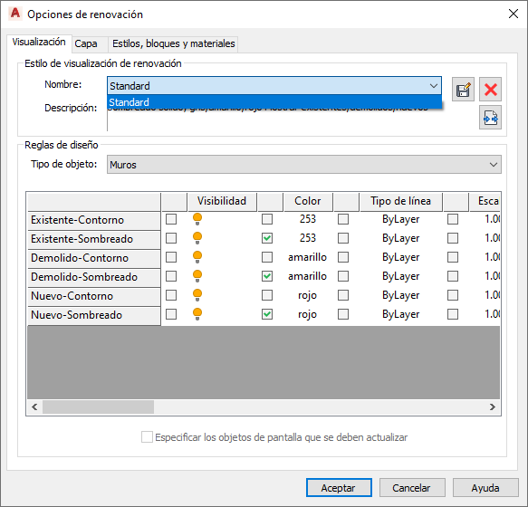 Los estilos de renovación se pueden modificar, guardar, suprimir, importar de un catálogo externo y exportar a un catálogo externo.