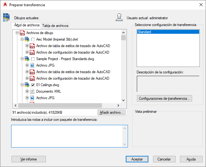 La transferencia electrónica de un dibujo significa que se empaqueta el dibujo para entregarlo en formato electrónico. Los archivos de dibujo del paquete de transferencia incluyen todos los archivos dependientes relacionados, como los archivos de tipos de letra y referencias externas.