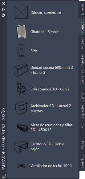 Para utilizar un elemento del catálogo de herramientas de Conjunto de herramientas AutoCAD Architecture 2027, arrástrelo hasta el espacio de trabajo del programa. Al arrastrar una paleta de herramientas al espacio de trabajo se añade esa paleta al conjunto de paletas predeterminado.