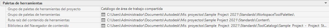 Si selecciona Catálogo de área de trabajo compartida, la ruta seleccionada en Grupo de paletas de herramientas se agregará al perfil del proyecto (AWS) y se accederá al catálogo de herramientas desde la ubicación especificada. Si selecciona Catálogo de área de trabajo por usuario, se crea una carpeta en C:\Mis documentos\Autodesk\Mis proyectos\<nombre proyecto> y se copian en ella las paletas de herramientas. Si selecciona Ninguno, el grupo de paletas de herramientas del proyecto estará desactivado para este proyecto, y no se visualizarán las demás propiedades de Paletas de herramientas.