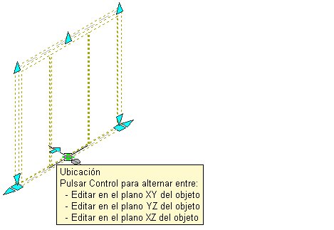 En una vista de modelo, el pinzamiento de ubicación tiene tres modos de edición posibles: Editar en plano XY del objeto, Editar en plano YZ del objeto y Editar en plano XZ del objeto. Pulse Ctrl para pasar de un modo a otro hasta que encuentre el que desee. El modo de edición predeterminado se encuentra en el plano XY. En la vista en planta, el pinzamiento de ubicación se limita al movimiento en un plano.