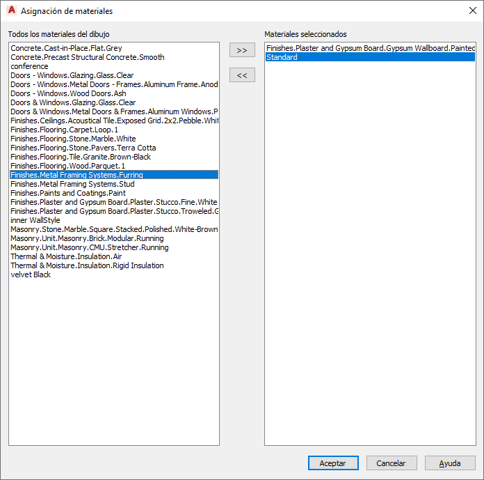 - Muestra todos los materiales definidos de AutoCAD que están disponibles en el dibujo.