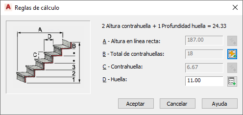 Algunas de las cotas interactivas las puede definir el usuario y otras son automáticas, según la combinación de campos seleccionados. Solamente están disponibles las combinaciones lógicas cuando la calculadora basada en reglas está en vigor. Cuando no está en vigor, el usuario puede definir la huella o la longitud recta, así como el total de contrahuellas o la altura de contrahuella.