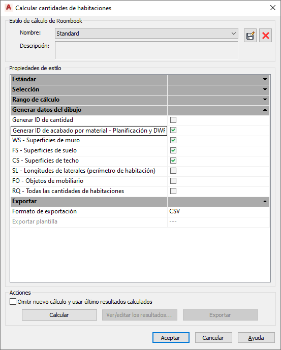 - En el cuadro de diálogo Calcular cantidades de habitaciones, en Propiedades de estilo, lista Generar datos del dibujo, seleccione Generar ID de acabado por material.