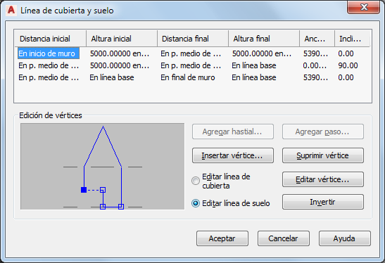 La tabla superior muestra información sobre cada uno de los vértices del muro cortina. Puede seleccionar un vértice que desea editar en la lista.