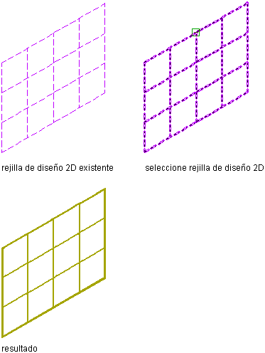 Puede crear una rejilla de unidad de muro cortina a partir de una rejilla de diseño 2D. Si ya dispone de rejillas de diseño 2D en el dibujo, puede convertirlas fácilmente en unidades de muro cortina. Asimismo, si ya sabe cómo utilizar las rejillas de diseño, es más práctico usarlas para crear las unidades de muro cortina y, después, probar los diferentes comandos de muros cortina para aprender a usar el resto de sus funciones.