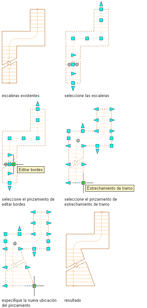 Nota: Si cambia la anchura de la escalera tras haber editado un lado con pinzamientos, los cambios realizados con los pinzamientos se perderán.