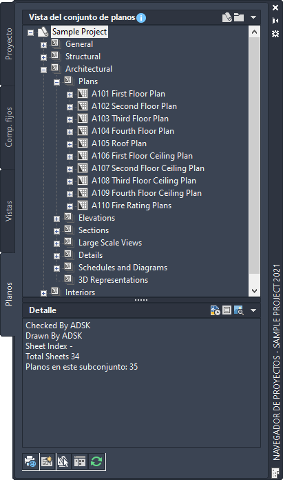 Conjunto de planos del proyecto en el Navegador de proyectos Conjunto de herramientas de AutoCAD Architecture 2027
