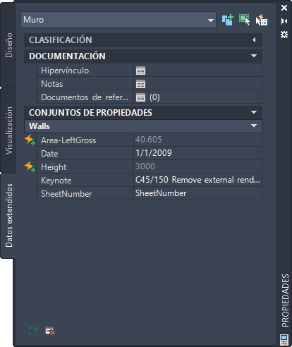 Propiedades de muro con campos de nota clave, fecha y numero de plano