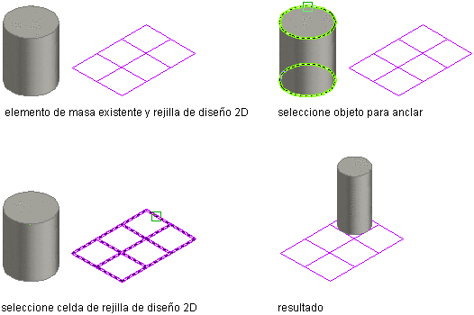 Puede agregar anclajes de celda a objetos para conectarlos a celdas en las rejillas de diseño y de volumen.