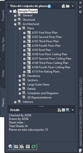 Todos los proyectos de Conjunto de herramientas AutoCAD Architecture 2027 tienen un conjunto de planos de proyecto simple, que contiene todos los planos del proyecto.