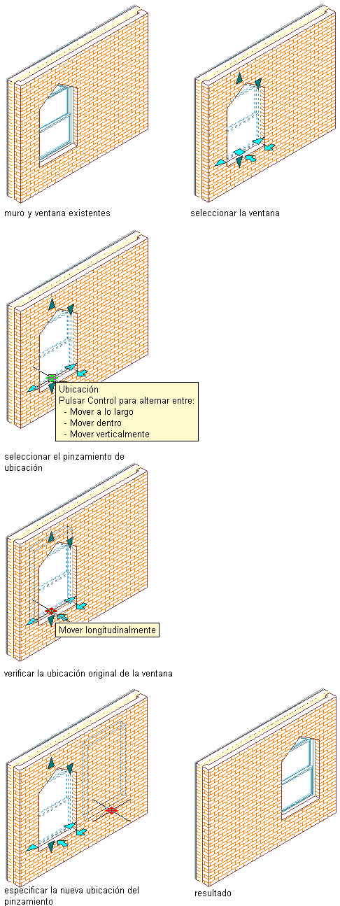 Esta función resulta útil cuando desea situar una ventana a una distancia determinada de otro objeto. Por ejemplo, puede especificar una distancia exacta entre una serie de ventanas en un muro.