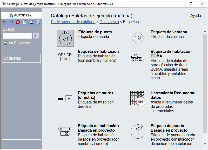 Utilice este procedimiento para copiar una herramienta de inserción de componentes de detalles o una paleta de herramientas desde el Catálogo de paletas de ejemplo en el Navegador de contenido hasta las paletas de herramientas que el usuario ha establecido en el espacio de trabajo. La mayoría de estas paletas están también incluidas en el conjunto de paletas de herramientas de ejemplo disponible en el espacio de trabajo, pero este catálogo del Navegador de contenido sirve como almacén de copias de seguridad de las herramientas y como fuente de herramientas que puede personalizar sin cambiar las que ya están en la paleta del espacio de trabajo. Normalmente, estas herramientas están predefinidas para que inserten un tipo y tamaño de componente concretos, pero una vez que están en una paleta del espacio de trabajo se pueden personalizar para insertar un tamaño diferente de componente o incluso un componente de una categoría diferente. Se puede usar el mismo procedimiento básico para copiar herramientas y paletas desde catálogos que el usuario crea, con el fin de conservar herramientas que están preconfiguradas y agrupadas para determinados proyectos.
