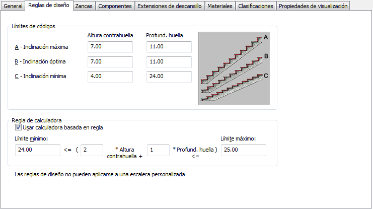 Utilice este procedimiento para especificar los límites de códigos mínimo, máximo y óptimo para la altura de contrahuella y la profundidad de huella, así como las reglas de calculadora de escaleras.