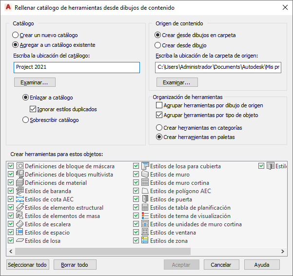 | agregar herramientas desde varios dibujos en una carpeta | seleccione Crear desde dibujos en carpeta, y especifique una ruta y un nombre de carpeta en Escriba la ubicación del origen. |