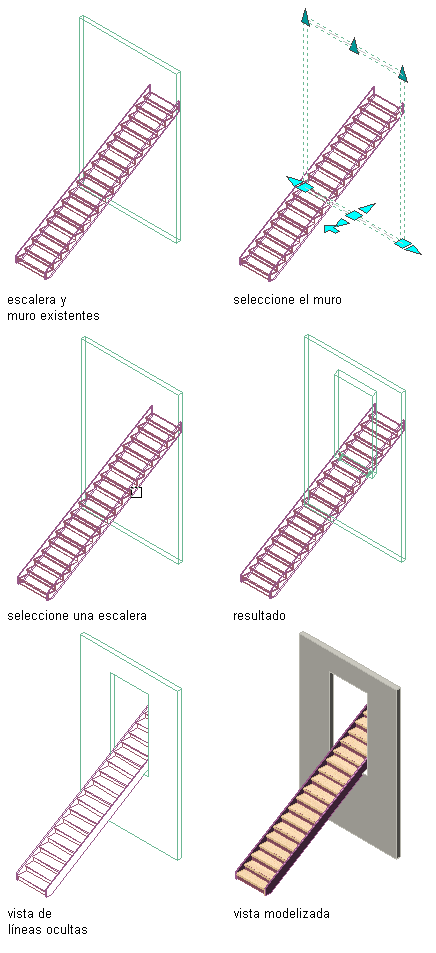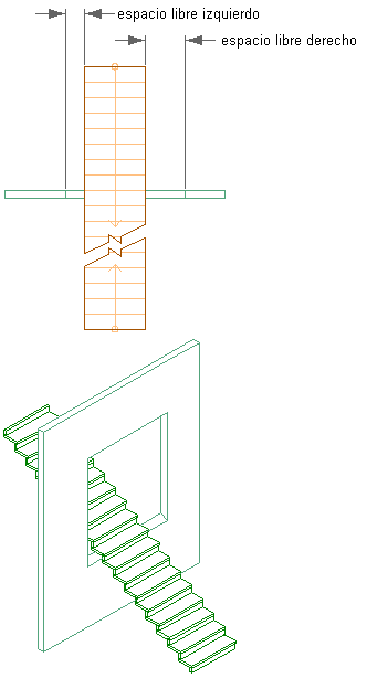 Utilice este procedimiento para crear un área de interferencia de escaleras en muros. Si incorpora una condición de interferencia entre una escalera y un muro, en el muro de la escalera se crea un hueco, basado en la altura de espacio especificada de la escalera, y en los espacios libres laterales izquierdos y derechos de escaleras rectas y con varios descansillos, o en los espacios libres internos y externos de escaleras en espiral y en forma de U.