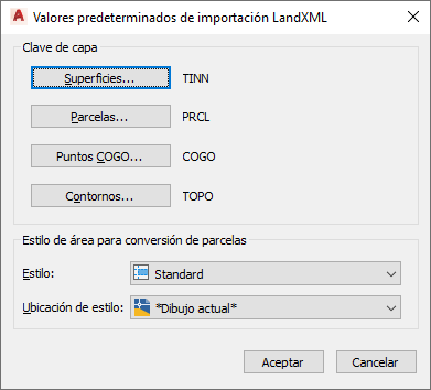 Si no define claves de capa concretas para los datos LandXML, los datos importados se colocan en las claves de capa predeterminadas establecidas para datos LandXM, TINN (superficies), PRCL (parcelas), COGO (puntos COGO) y TOPO (contornos).
