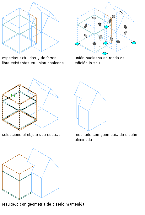 Siga este procedimiento para sustraer un espacio u otro objeto AEC de un espacio tridimensional de forma libre. Puede sustraer de un espacio cualquier objeto AEC que tenga una geometría 3D.