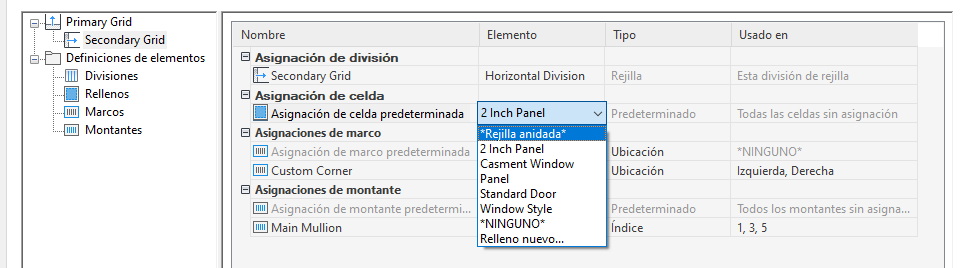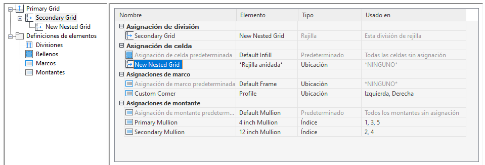 Se agrega una rejilla nueva a la lista de rejillas del panel izquierdo del cuadro de diálogo. Si está editando la rejilla principal, la nueva rejilla se agrega al nivel secundario. Si está editando una rejilla de nivel secundario, la rejilla adicional se incluye en el nivel terciario, y así sucesivamente.