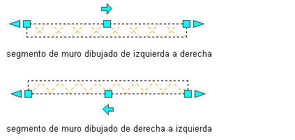 La dirección resulta importante para realizar algunas modificaciones en los muros. Los estilos de muro de ejemplo incluidos en Conjunto de herramientas AutoCAD Architecture 2027 se han diseñado para colocar los muros de perímetro en la dirección de las agujas del reloj. Una vez colocado un muro, se puede determinar su dirección seleccionándolo. El pinzamiento de dirección del muro indica su dirección. También se puede invertir la dirección de los muros.