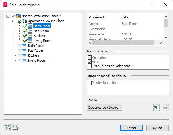 - Los espacios y las zonas que se deben incluir en el cálculo de la planta se seleccionan activando sus casillas de verificación.