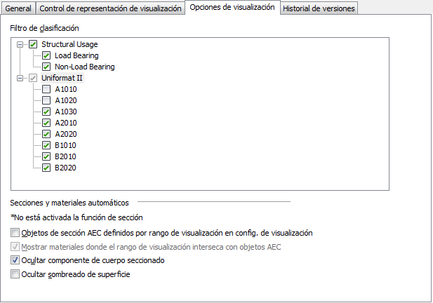 Por ejemplo, si desea ocultar todos los muros y puertas clasificados como A1010 y A1020, en Uniformat II desmarque las casillas de verificación de A1010 y A1020.