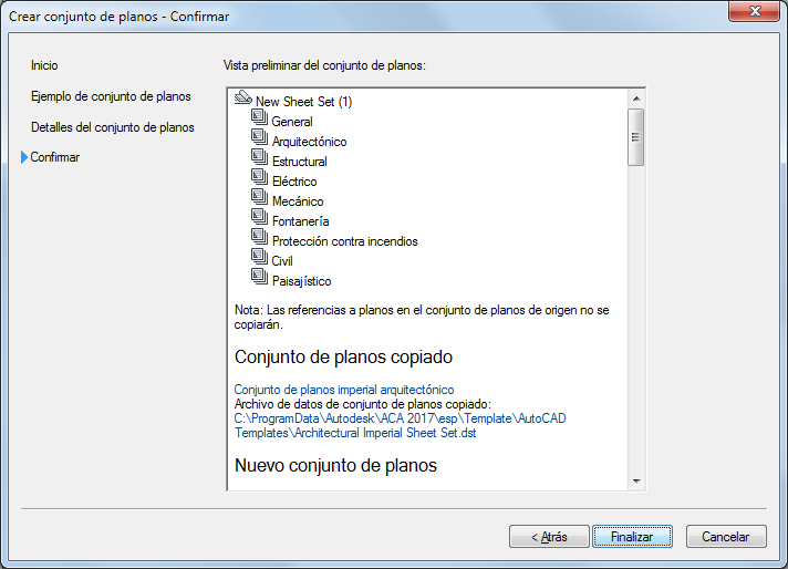 | finalizar la creación de la plantilla de conjunto de planos | pulse Finalizar. |