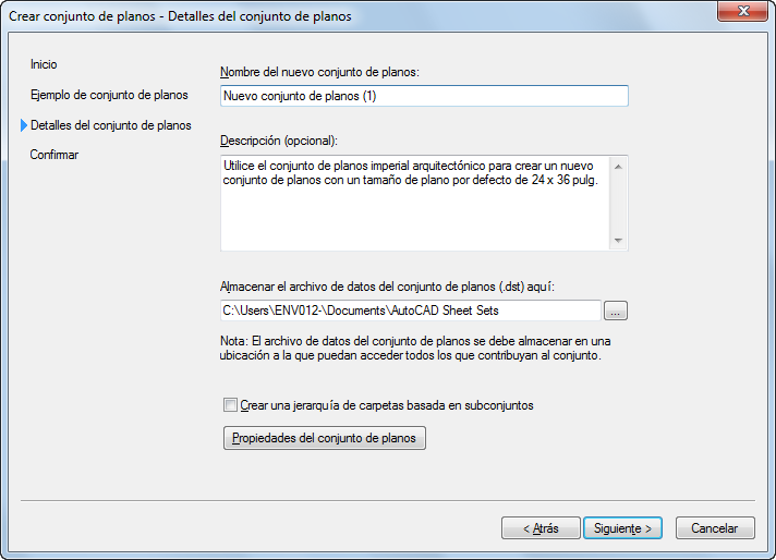 Si crea una plantilla de conjunto de planos para un proyecto de Conjunto de herramientas AutoCAD Architecture 2027, la selección de Crear una jerarquía de carpetas basada en subconjuntos no tendrá efecto, ya que se asociarán automáticamente las carpetas correspondientes a los subconjuntos de planos del explorador de dibujos. Si está creando una plantilla de conjunto de planos para un conjunto de planos de AutoCAD, puede seleccionar esta opción. De este modo, se creará una subcarpeta en el conjunto de planos cada vez que cree un subconjunto de planos en el Administrador de conjuntos de planos.