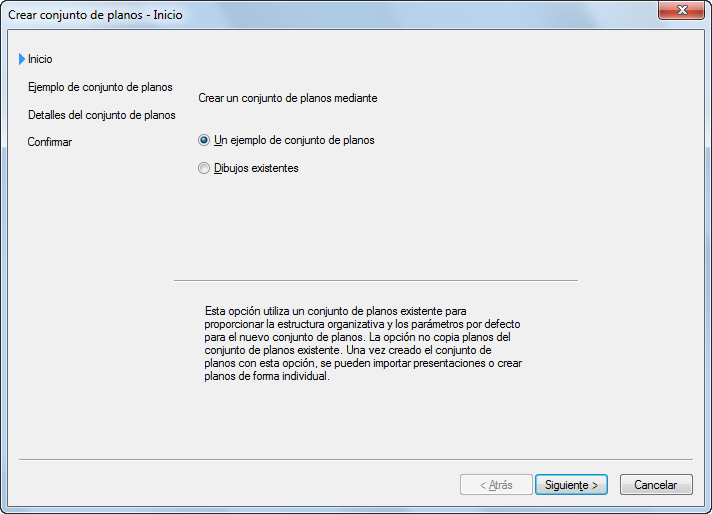 | utilizar un conjunto de planos de ejemplo de la lista | pulse Seleccionar un conjunto de planos para usarlo como ejemplo, seleccione un conjunto de planos de la lista y, a continuación, pulse Siguiente. |
