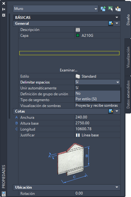 - En la paleta Propiedades, visualice el parámetro Delimitar espacios en una de las ubicaciones siguientes: