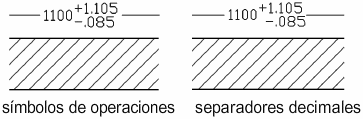 Además de la colocación vertical de los valores de tolerancia, es posible controlar la alineación horizontal de los valores de tolerancia superiores e inferiores. Los valores de tolerancia superiores e inferiores se pueden alinear mediante símbolos de operaciones o separadores decimales.