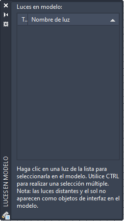 Un icono en la columna Tipo indica el tipo de luz (puntual, foco o distante) y si está activada o desactivada. Seleccione una luz de la lista para seleccionarla en el dibujo. Para ordenar la lista, haga clic en el encabezamiento de columna Tipo o Nombre.