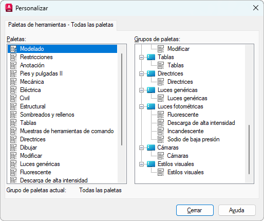 En la ventana Paletas de herramientas, se muestran todas las paletas de herramientas disponibles y se pueden crear y administrar grupos de paletas.