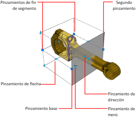 - Pinzamiento Base. Actúa como el punto base para los desplazamientos, cambios de escala o giros que se realizan en el objeto de sección. Siempre aparece junto al pinzamiento de menú.