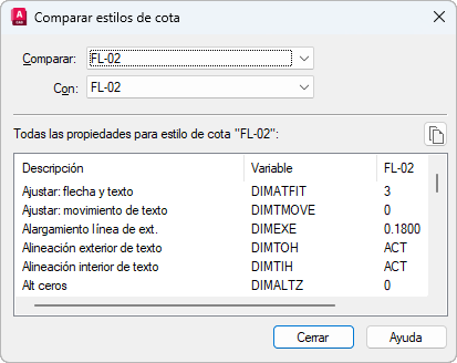 Compara las propiedades de dos estilos de cota o muestra todas las propiedades de un estilo.