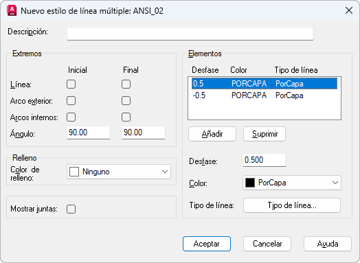 4. En el cuadro de diálogo Nuevo estilo de línea múltiple, seleccione los parámetros del estilo de línea múltiple y haga clic en Aceptar.