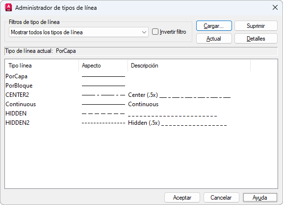 Muestra los nombres de los tipos de línea cargados. Para cambiar el nombre a un tipo de línea, elija el tipo de línea y, a continuación, vuelva a hacer clic sobre él y escriba un nuevo nombre. Los tipos de línea PORCAPA, PORBLOQUE, CONTINUOUS y los dependientes de las referencias externas no pueden renombrarse.
