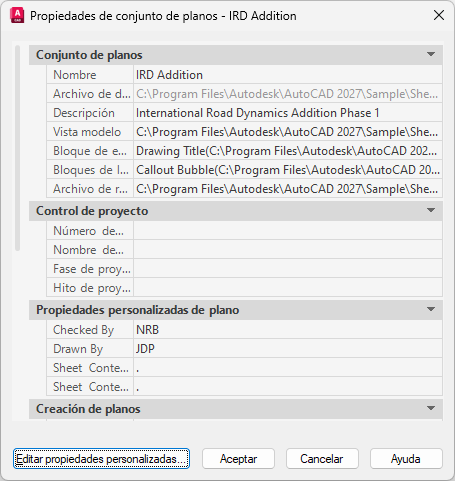 Esto incluye información como la ruta y el nombre de archivo del archivo de datos de conjunto de planos (DST), las rutas de las carpetas que contienen los archivos de dibujo asociados al conjunto de planos y las propiedades personalizadas vinculadas al mismo