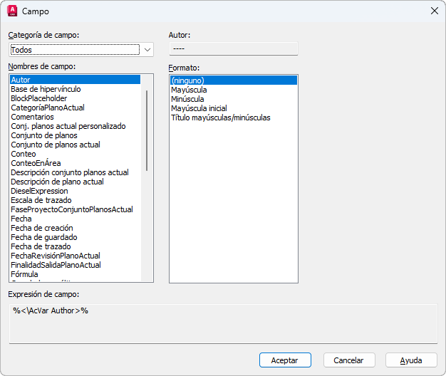 El rótulo de este elemento cambia en función del nombre del campo. Por ejemplo, si se ha seleccionado Nombre de archivo en la lista Nombres de campo, el rótulo es Nombre de archivo y el valor es el nombre del archivo de dibujo actual. Para los campos de objetos, el rótulo es Propiedad. Excepción: Cuando se selecciona un campo de fecha, se muestra el formato de fecha seleccionado, por ejemplo, M/d/aaaa.