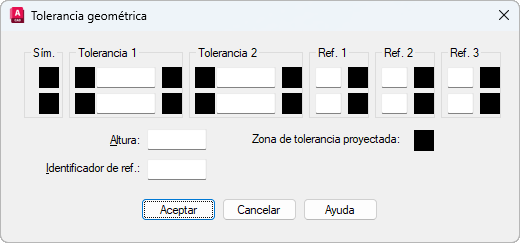 Muestra el símbolo de características geométricas, que puede seleccionar en el cuadro de diálogo Símbolo. Este cuadro de diálogo aparece al seleccionar uno de los cuadros Sím.
