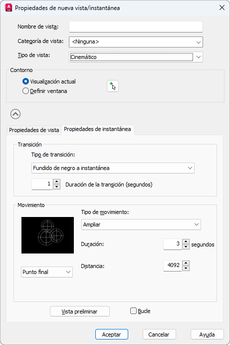 Establece la distancia necesaria para completar el movimiento cuando se asigna a la vista guardada el tipo de vista Cinemático.