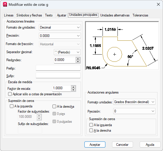 Por ejemplo, si introduce 2, la cota para una línea de una pulgada se visualizará como dos pulgadas. El valor no afecta a las cotas angulares y no se aplica al valor de redondeo ni a los valores de tolerancia más o menos.
