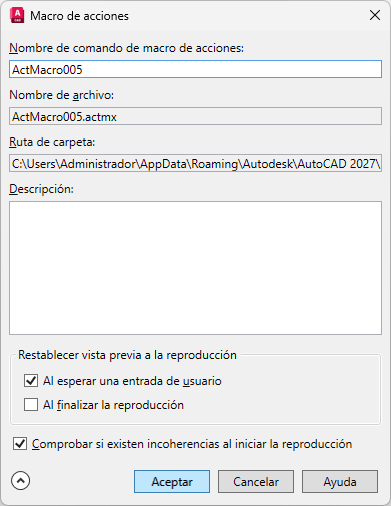 Puede guardar o cambiar el nombre de la macro de acciones actual y definir su comportamiento de reproducción. Se puede suprimir la visualización de este cuadro de diálogo. Para ello, desactive el parámetro Solicitar nombre de macro de acciones en el cuadro de diálogo Preferencias de la grabadora de acciones.