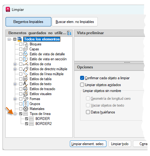Para limpiar todos los tipos de línea sin referencia, seleccione Tipos de línea.