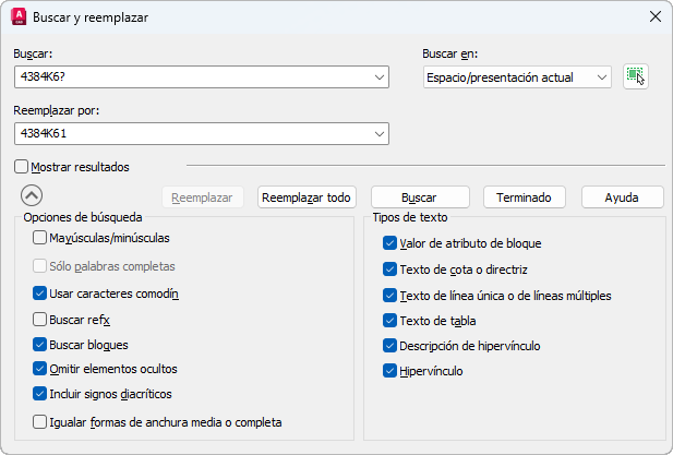 Por ejemplo, si existen varias piezas similares en el dibujo, pero necesita cambiar todas a 4384K61, escriba 4384K6? en el cuadro Buscar y 4384K61 en el cuadro Reemplazar por.