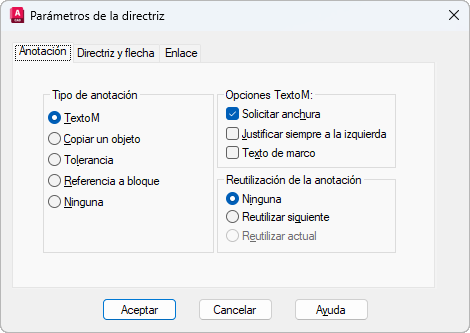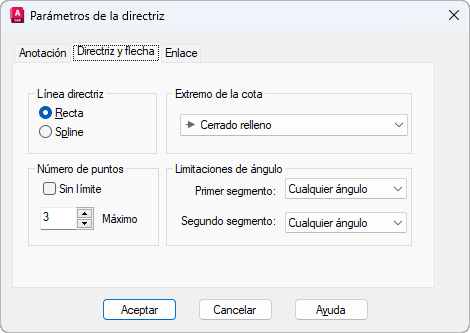 El cuadro de diálogo Parámetros de la directriz incluye las fichas siguientes: Anotación, Directriz y flecha y Enlace