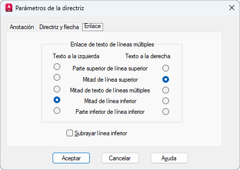 Establece la ubicación del enlace de las líneas directrices y la anotación de texto de líneas múltiples. Esta ficha está disponible únicamente cuando se selecciona TextoM en la ficha Anotación.