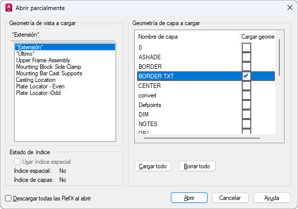 Puede seleccionar y cargar geometría de una vista, de un área seleccionada y de capas. No se puede descargar la información que se encuentra cargada en el dibujo. Si el dibujo contiene referencias externas enlazadas que no se cargaron en el momento en que se abrió parcialmente el dibujo, puede volver a cargarlas utilizando la paleta Referencias externas. Véase REFX.